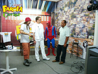 Biólogo Carlos Simas falando aos apresentadores Ernesto Bianch(de branco) e Dom Ratão(chapéu vermelho) tendo ao fundo o Homem aranha, com o folder da Dengue.